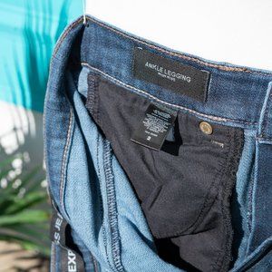 Size 2. Can fit a size 4 due to stretch. High Rise Express stretch ankle jeans. Super flattering and hugging to the body. Nice washed denim look. 27 1/2' inseam. fly/button closer. front and back pockets.