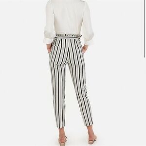 Chic and polished, these Express high rise ankle pants feature bold black and white vertical stripes that elongate the legs and make a statement. Ankle-length with a slim silhouette and subtle ruffle waist detail for a playful touch. Lightweight and perfect for work or weekend.