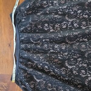 Express high waisted lace skirt. Size 12. Knee length. Zipper in the back works well. Like new condition! No flaws. Tried on but never worn. Material has very little stretch. Fabric shell is 100% nylon, combo is 100% polyester, waistband is 98% polyester, 2% spandex. The waist is approximately 15 inches and the length is approximately 25.5 inches. The skirt is fully lined in pink polyester, has a layer of pink tulle on top, then has a layer of lace, and black tulle on top.