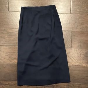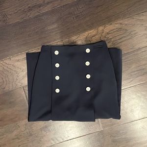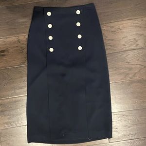 This deep navy midi skirt from Express is so cute with cream button down accents for a sailor-inspired look. This will surely be an upgrade to anyone’s work wardrobe. It features a flattering high waisted fit with 2fron side slits on both sides, side hook and zip closure, hits just below the knee, and a straight hem.