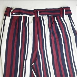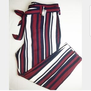 Gorgeous burgundy red, white and navy blue striped ankle pants. Sexy and practical sash, side pockets, button, clips and zipper closure. So elegant and fun for any occasion.