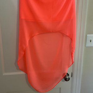 I bought this a while back to wear to a college graduation party, and I received so many compliments on it. The coral color is absolutely gorgeous and the hi-lo overlay skirt is fun and flirty. The under skirt is stretchy, so it's very comfortable.
