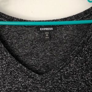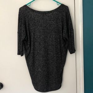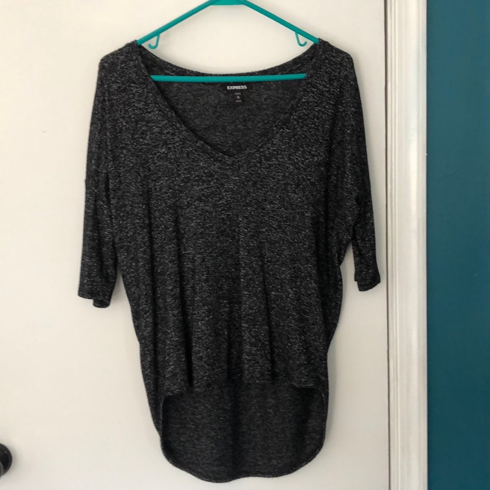 Only worn once. The sleeves hit at about the elbow. If you are truly an XS this sweater will show a lot of cleavage. It’s a darker heather-grey.