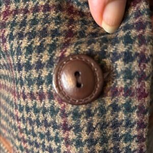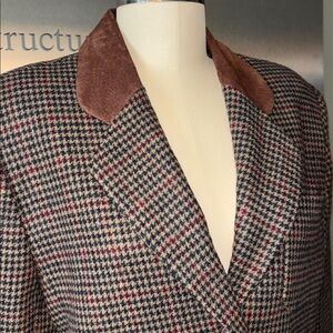 Beautiful stylish vintage wool blazer houndstooth patterned fabric in green, blue and burgundy. with a chocolate brown suede collar and suede accents on the pockets. Blazer is in EUC based on the age. See pics of moth holes. They are small and easily repaired by a tailor or an easy diy project with some needle and thread. Please reference measurements for accurate sizing. Bust 20 3/4”. Sleeves 23”. Length from top of collar 32”. Jacket is fully lined. Smoke free home. Thanks for checking out my closet.
