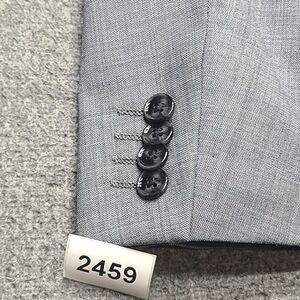 Color: Gray with subtle texture. Two front button closure. Two flap front pockets and single chest pocket. Double vent back. Four-button cuff detail. Premium Express Innovator "Extra Slim" fit.