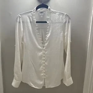 Chic ivory blouse with ruffle button detail. Long sleeves and elegant design.