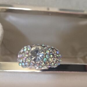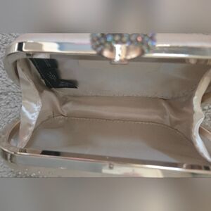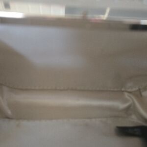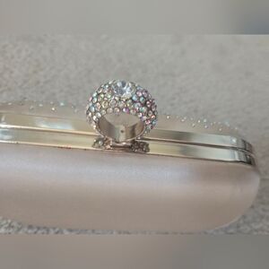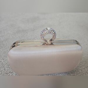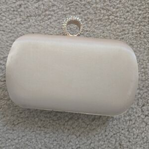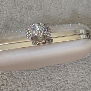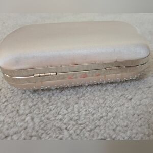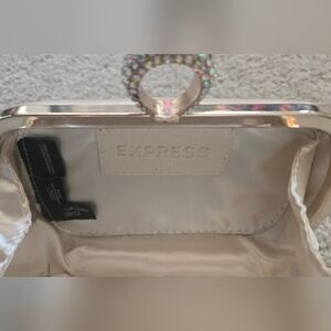 Express ivory satin rhinestone evening clutch. All rhinestones are intact. There are some scratches on the back and some discoloration on the metal on the bottom of the bag. Some discoloration inside. Good used condition with signs of wear.