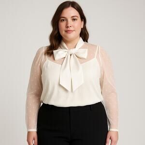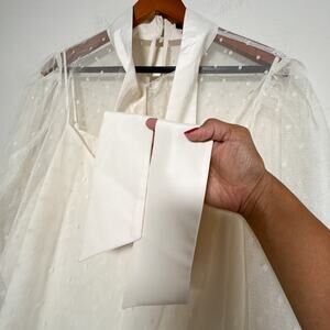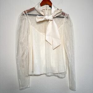 Express Ivory Sheer Swiss Dot Mesh Bow Tie Blouse Long Sleeve Top XL