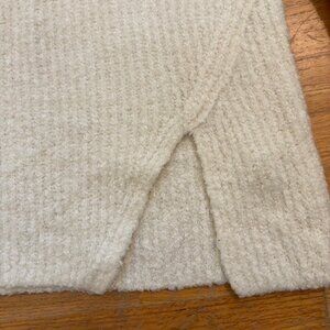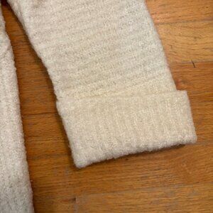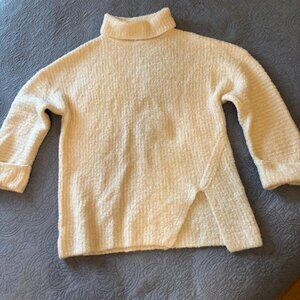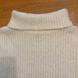 Warm and cozy chunky knit textured wool blend sweater from Express in Ivory. Low turtleneck. Rolled cuffs and slit hem. Light stretch. Made of 59% polyester, 29 acrylic%, 9% wool, 3% spandex. Machine washable.