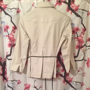 Adorable Express stretch jacket . Can be worn as a light weight jacket paired with a cute pair of skinny jeans. Quarter length sleeves with slits on the forearm. Has a leather belt. Form fitting.