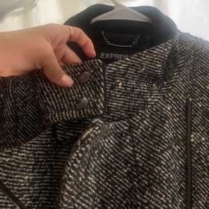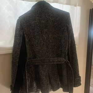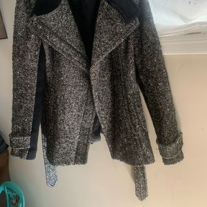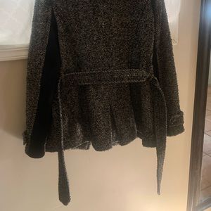 Thick knitted material (wool like), in great conditions/well taken care off, no rips, no bad foldings, zipper works perfect, super cozy, cute and stylish. (With belt)