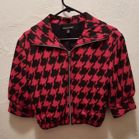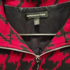 Express Jacket, Red and Black Houndstooth Print, Cropped Fit, Shorter Sleeve Length, Zip to Top of Collar, Elastic Bottom