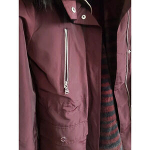 Elevate your winter wardrobe with this stunning Express jacket for women. The wine-colored jacket comes in a mid-length style with long sleeves and a full zip closure. The faux fur hood and zebra liner add a touch of glamour to your everyday style.