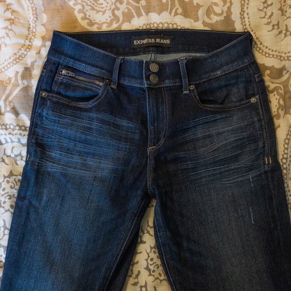 Size 6 regular dark skinny jeans with two buttons & a small pocket zipper. Mild intentional distress.