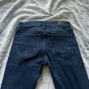 Dark faded Express jeggings. It leg opening has a cut off style right at the ankle. Thicker quality, soft material.