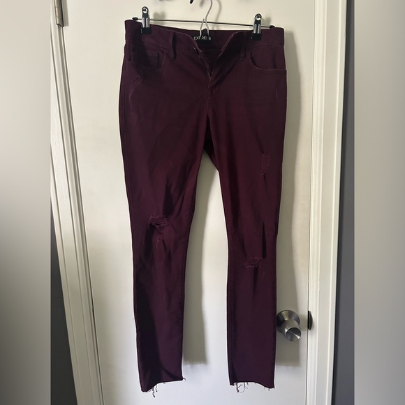 Express ankle legging jeans, mid-rise, size 0, maroon, and only worn once! The style does have the rips in the knees and fringe at the ankles