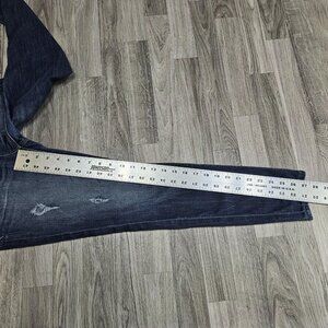 Condition: Gently worn stretch denim with intentional distressing and frayed areas. Fabric clean with no stains or unintentional holes. Hardware, zipper, and seams all intact.