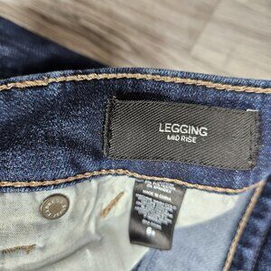 Style: Womens Legging Mid Rise skinny jeans in a dark blue wash with whiskering, fading, and distressed/ripped details on the front and back.