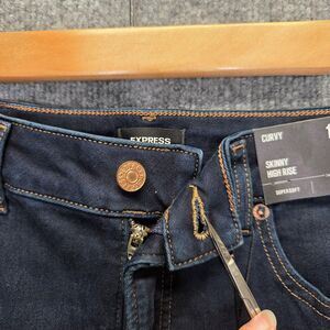 Brand details: EXPRESS logo patch at back waistband; EXPRESS branded front button; interior tag reads "CURVY SKINNY HIGH RISE"
