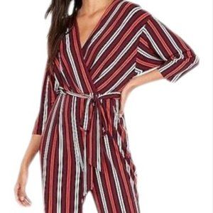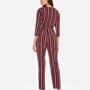 This Express striped, belted jumpsuit is effortless style. A sexy surplice front, silky fabric and classic three-quarter sleeves and slant hand pockets make this sleek jumpsuit a go to wardrobe staple.