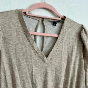 Super comfy tan jumpsuit with drawstring at the waist. 3/4 length sleeves and a v neck. It has a loophole in the back with 2 closures. Like new condition.