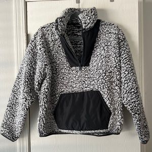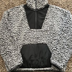 Super-soft, super-cozy sherpa pullover sweater from Express. Size S. Gray and white sherpa inside and out. High neck, half-zip front and kangaroo pocket with smooth panels. Sleeve opening and straight hem are the same material as the front panels. Very warm and comfy for cold nights.