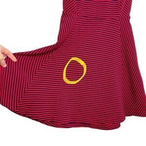 Express Knit Navy Blue & Red Striped Sleeveless Fit & Flare Dress. Size XS. In preowned condition: has a faint spot on the front skirt area (see circled pics for different angles) and pilling/wash wear. Stretchy polyester/rayon/spandex knit fabric. Sleeveless. Keyhole opening at back.