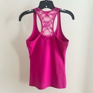 A scoop neck tank in a comfortable stretch fabric complete with a lace back. Perfectly styled with shorts or yoga pants.