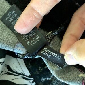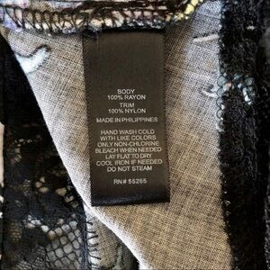 Gorgeous sheer lace cutouts at waist and above hem. Lace hem finish. Flutter cap sleeves. Scoop neck. Black dress with bright purple and blue flowers. Elastic at waistband and sleeves. Hi-low skirt.