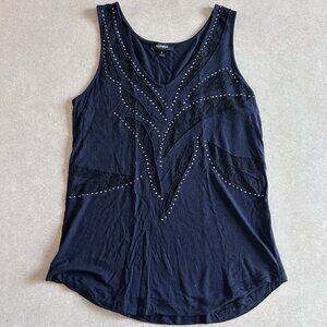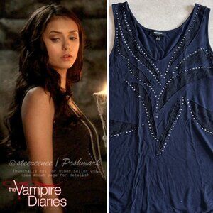 Express Lace & Stud Tank as seen on Katherine Pierce (Nina Dobrev) in The Vampire Diaries season 3 episode 6 (2011). Same style and brand. Possibly an alt color since this one seems more blue, but it could be from washing or dye.