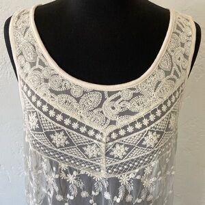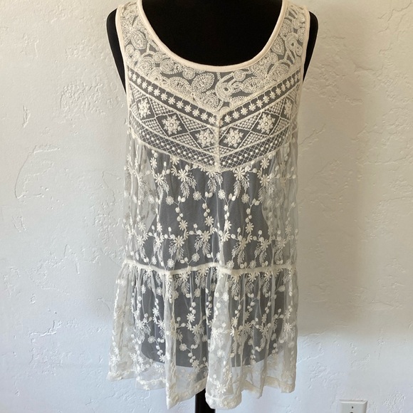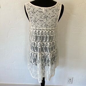 This sleeveless blouse in a soft cream color features an asymmetrical tiered design, offering a chic and modern look. The intricate lace patterns add a touch of elegance, making it perfect for both casual and formal occasions. Its flowing fit and unique style make it a versatile addition to any wardrobe.