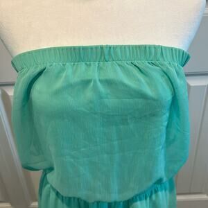 Excellent pre-owned condition, no flaws, size large Express strapless mini-dress. Mint green is simple and feminine. No zippers or button entry dress is pull on style, top is elastic and has cinching at waist for a form-fitting but comfortable fit. Entire dress is lined, but very lightweight with chiffon overlay. Great option for a wedding guest at a summer or beach wedding or for a baby or bridal shower. Top does have tabs on interior where it appears straps could have been attached but do not have those to include.