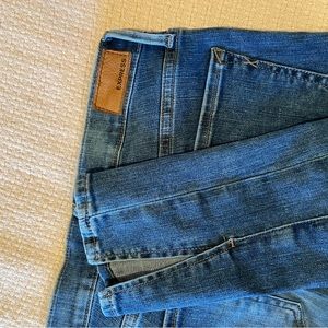 Darker denim with some lighter distressed coloring on the thighs. Piping down the front of each leg. Ankles taper, and end with a slit. In excellent condition.