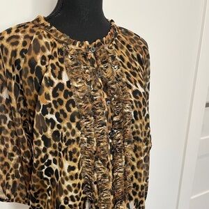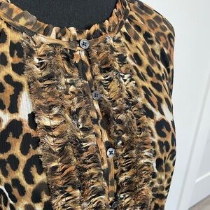 Express Leopard Long Sleeve Sheer Ruffle Front Blouse