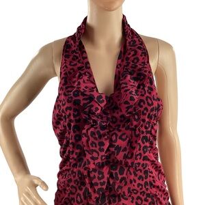 express halter top, leopard print sleeveless top, red animal print blouse, clubwear express top, red black halter blouse, express ruffle neck top, sleeveless express shirt, stretchy animal print top, party top express, night out red top