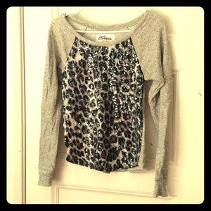 Cute and cozy gray leopard print sequin sweater with tapered edges at hip from the Love Express line. Works well with black or dark jeans. Adds the perfect amount of sparkle for your newest winter look!