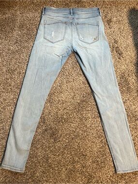Light blue skinny/legging jeans with distressed rips. Slim, figure-hugging silhouette. Classic five-pocket style. Stretch fabric. 28” inseam. Size 4R. Mid-rise. Worn once. As is.
