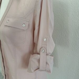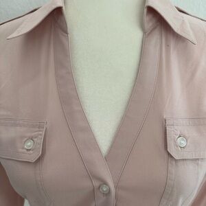 Chic light pink button-down shirt with front pockets. Ideal for any occasion.