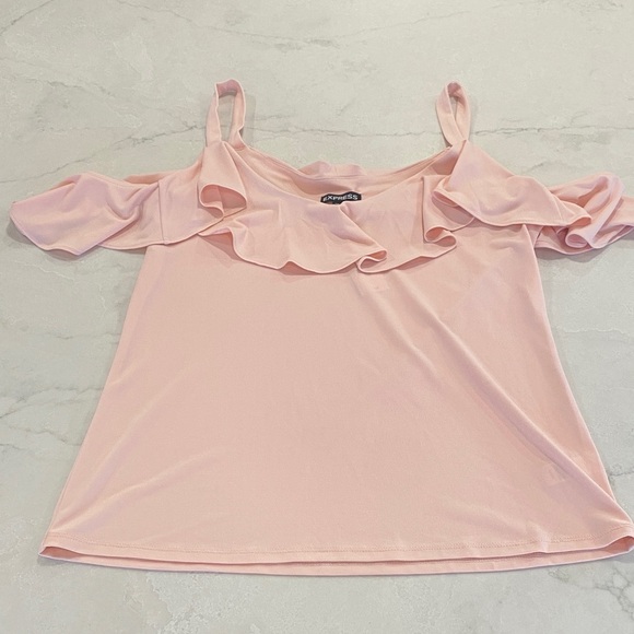 Stylish light pink blouse with ruffle details. Ideal for casual or dressy occasions.