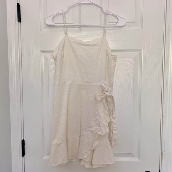 Features stretchy back, adjustable straps, ruffle cross front skirt, side tie design. Cool linen fabric. Wrinkles will be steamed out prior to shipping.