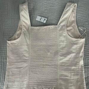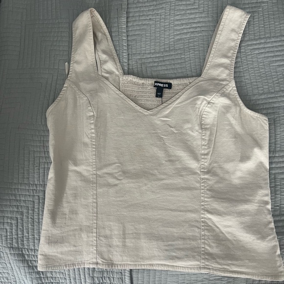 This tank is complete with a straight hem, square neck and a linen-blend fabric.