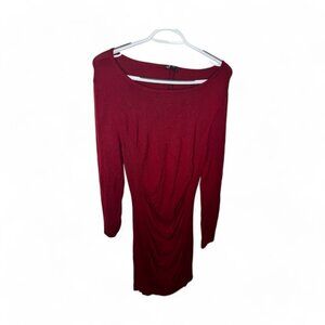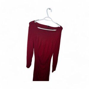 Make a bold statement with this deep red Express bodycon midi dress. Featuring long sleeves and a figure-hugging silhouette, it's perfect for a night out or a special event. The subtle ruched detailing adds a touch of elegance while ensuring a flattering fit. Designed with a soft and stretchy fabric for both comfort and style. Ideal for pairing with heels and a statement clutch.