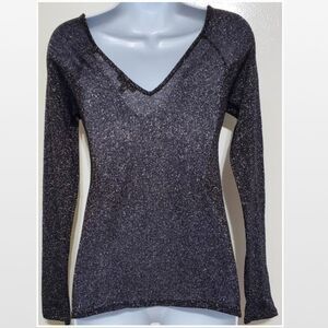 Express small black shirt with silver shiny sparkles. Features scoop neckline, deeper cut V-neck back, semi sheer, & sparkles shimmer throughout stretchy knit fabric. Approx. arm pit to arm pit 15”, arm 28” from neck, 25.5”T. Ask any questions before purchasing. Same or Next Day Shipping 🎁 Hit the buy now button, Make an Offer, or Bundle to Save 😊💕 All sales final & sold as is.