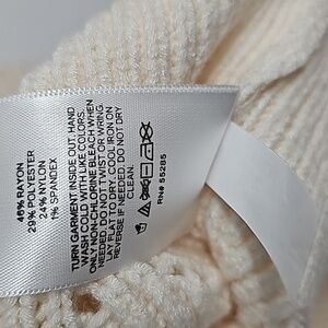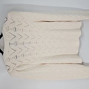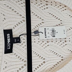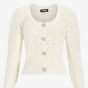 Express Gorgeous Statement Sweater. Puffed Sleeves, Loose Knit, Crystal & Pearl Buttons. Feminine, Delicate, Soft Silhouette.