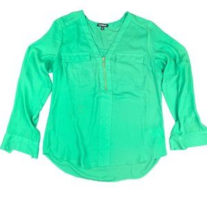 For sale: 2 Express blouses, perfect for work or casual. One is a bright, beautiful green shade with 2 breast pocket accents and a quarter zipper closure. The other is a Portofine shirt in white with black polka dots and button closures.
