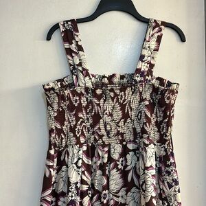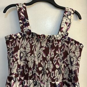 Smocked bodice, tiered skirt, square neckline, and pleated straps