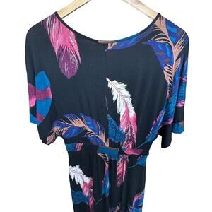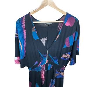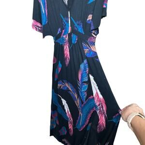Express Maxi Dress Black Pink Feather Print V-Neck Front Slit Stretch Women’s XS
