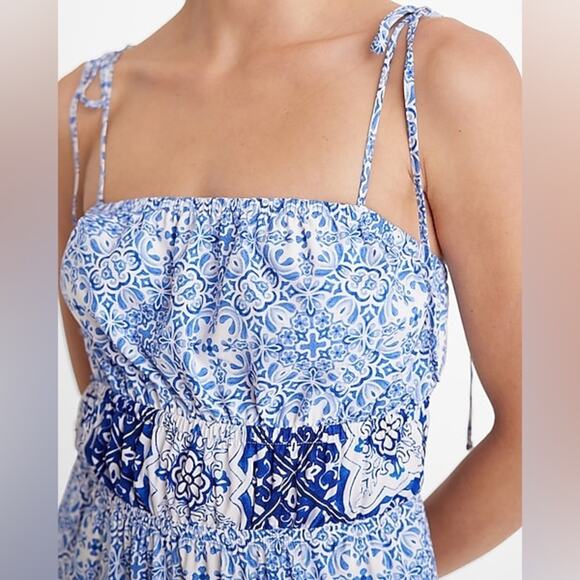 Complete with tie spaghetti straps, this maxi dress features printed tiered layers, a square neck, and and elastic waistline.