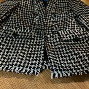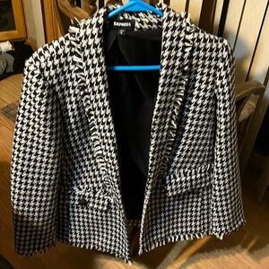 Express Medium Open Style Lined Black and White with hint of Gray Blazer. Has two front pockets with buttons to add detail. It is gorgeous with the fringe adding more detail to its style. Fabric is polyester and wool. Great addition to your wardrobe. Following measurements are approximate: Pit to Pit 18” Length including fringe 27”. Excellent like new condition.