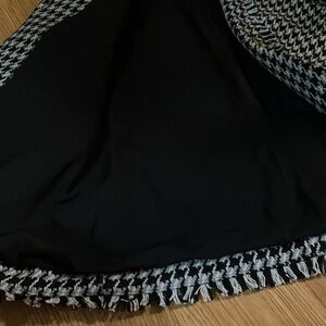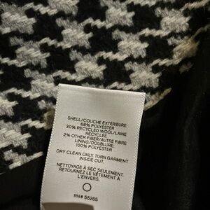Express Medium Open Style Lined Black and White with hint of Gray Blazer. Has two front pockets with buttons to add detail. It is gorgeous with the fringe adding more detail to its style. Fabric is polyester and wool. Great addition to your wardrobe. Following measurements are approximate: Pit to Pit 18” Length including fringe 27”. Excellent like new condition.